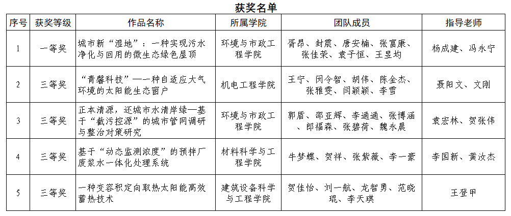 杨成建老师指导的作品:城市新“湿地”:一种实现污水净化与回用的微生态绿色屋顶。全国大学生节能减排社会实践与科技竞赛是由教育部高等教育司主办的全国性大学生课外科技作品竞赛,是教育部确定的全国十大大学生学科竞赛之一,首批纳入高教学会学科竞赛评估体系。