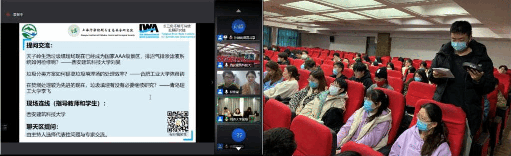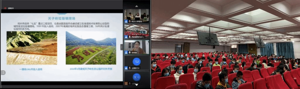 环境科学和环境工程专业2017级近200名同学佩戴口罩,有序进入多媒体会议室,参与“2021校-企-协云端实习”第三讲:生活垃圾处理技术。主讲人为来自杭州市天子岭生活垃圾卫生填埋场的赵佳莹老师。