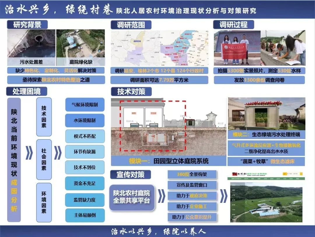 团队将结果与陕西省生态环境厅汇报,获得高度认可;同时与陕西博新联环等多家企业开展合作,共同营建一种“ 治水兴乡, 绿绕村巷” 的人居环境。